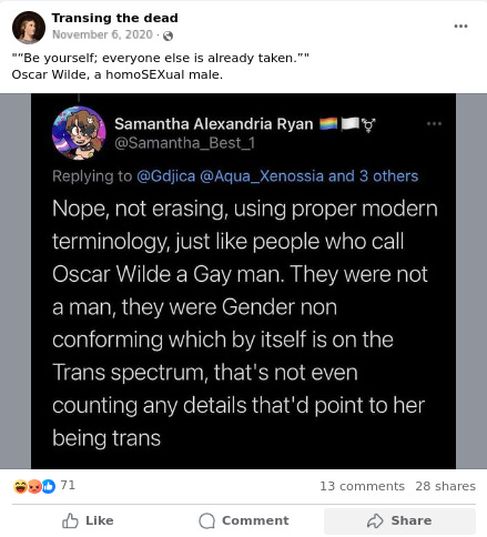 The Facebook group Transing The Dead takes to task the Rainbow Gang revisionists who comb the annals of history seeking to bolster their bogus sex-changing narratives with ‘examples’ of mavericks, deviants, bohos, and dissenters who didn’t live the strictly gendered lives of their peers.